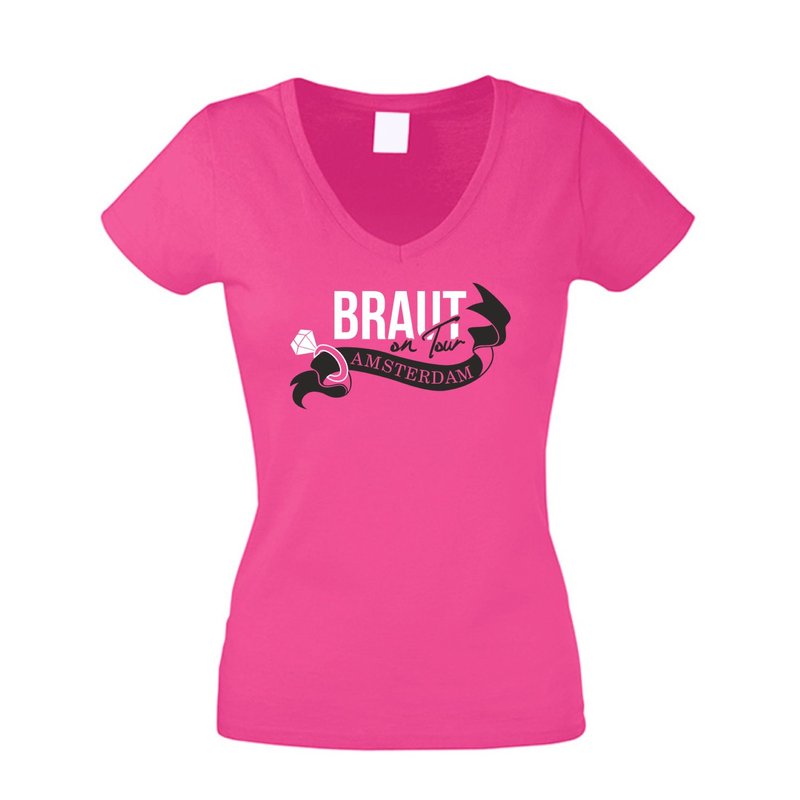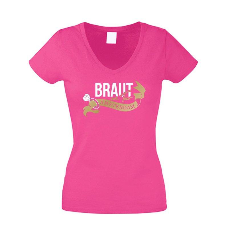 Damen T-Shirt V-Neck - Braut on Tour - Amsterdam - JGA Junggesellinnenabschied weiss-fuchsia XS