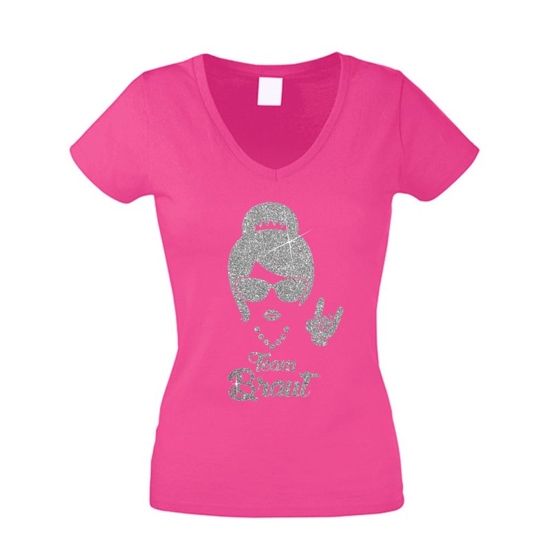 Damen T-Shirt V-Neck - Team Braut - Glitzer - Rock n Roll fuchsia-schwarzglitzer XS