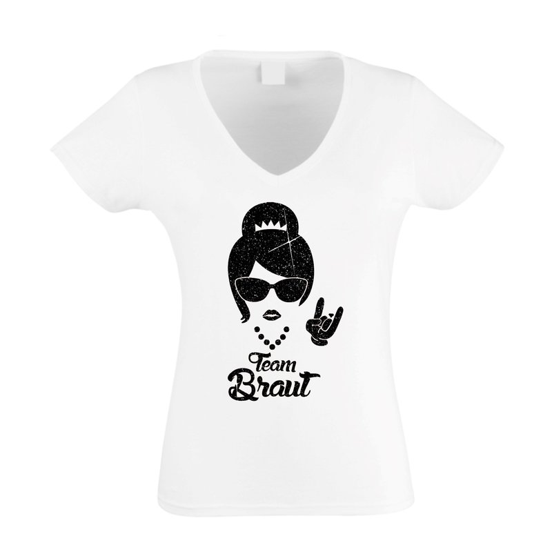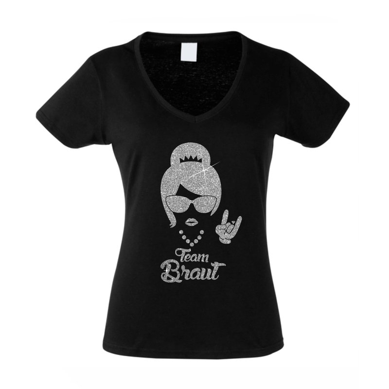 Damen T-Shirt V-Neck - Team Braut - Glitzer - Rock n Roll