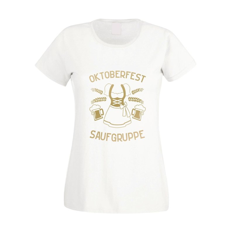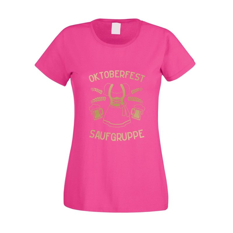 Motiv: Auf diesem Dirndl T-Shirt für Damen steht Oktoberfest Saufgruppe, verziert mit einem Dirndl und zwei Maßkrügen. Das Oktoberfest steht mal wieder vor der Tür, doch du und deine Mädels wollt kein teures Geld für eine Tracht ausgeben? Kein Problem, wähle aus den verschiedenen Farbkombinationen und den Größen XS - XXL unserer Damen T-Shirts deinen persönlichen Favoriten und sei trotzdem der Hingucker auf dem berühmten Volksfest.
