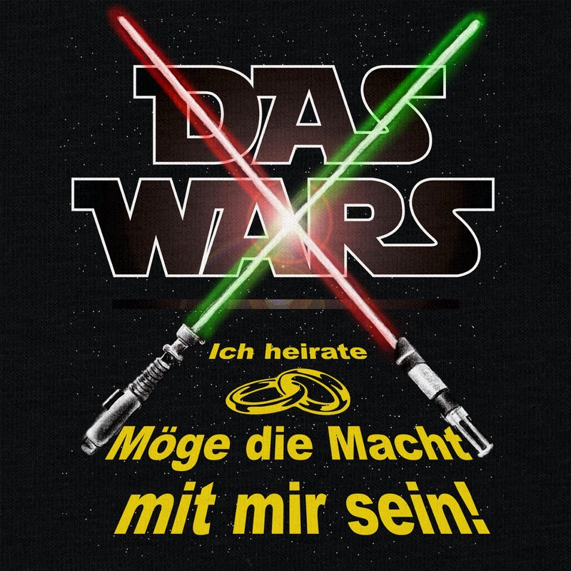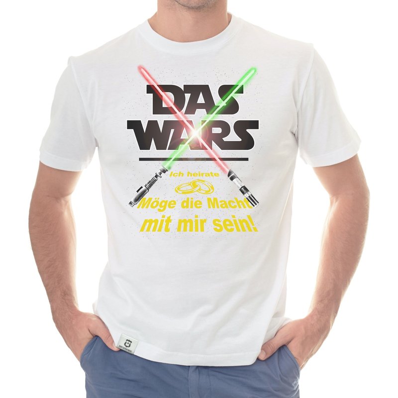 Motiv: Auf diesem neuen JGA-T-Shirt für Herren steht: "Das Wars - Ich heirate - Möge die Macht mir mir sein!". Wenn auch der zukünftige Bräutigam ein großer Fans ist, dann wählt jetzt aus den verschiedenen Farbvarianten und den Größen S - 5XL unserer Herren T-Shirts euren persönlichen Favoriten und macht seinen letzten Abend unvergesslich!