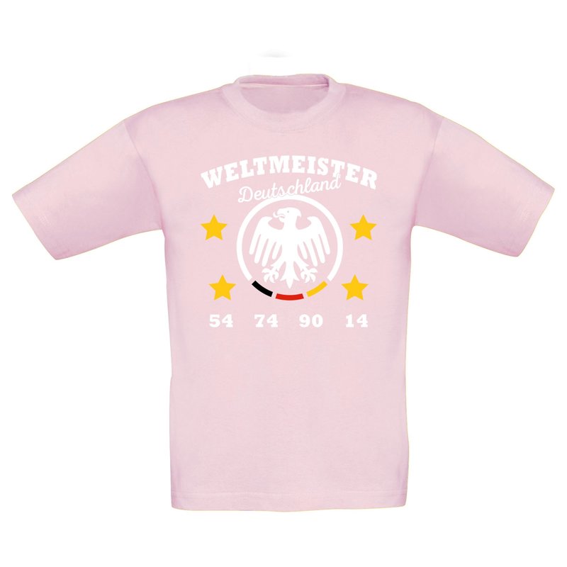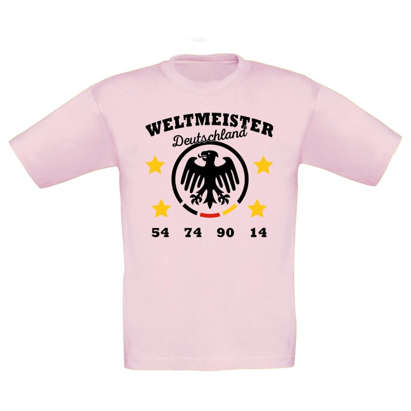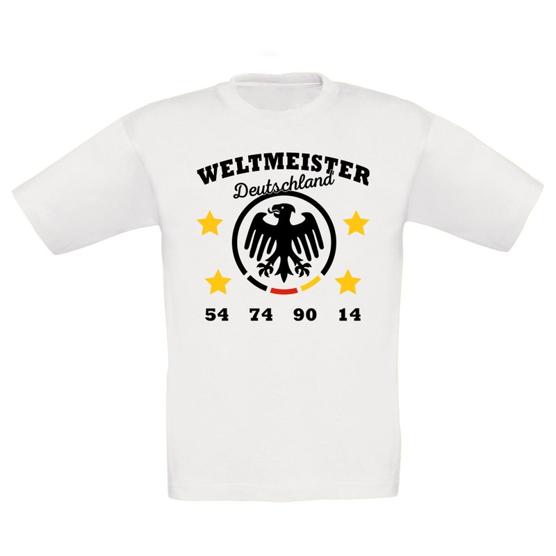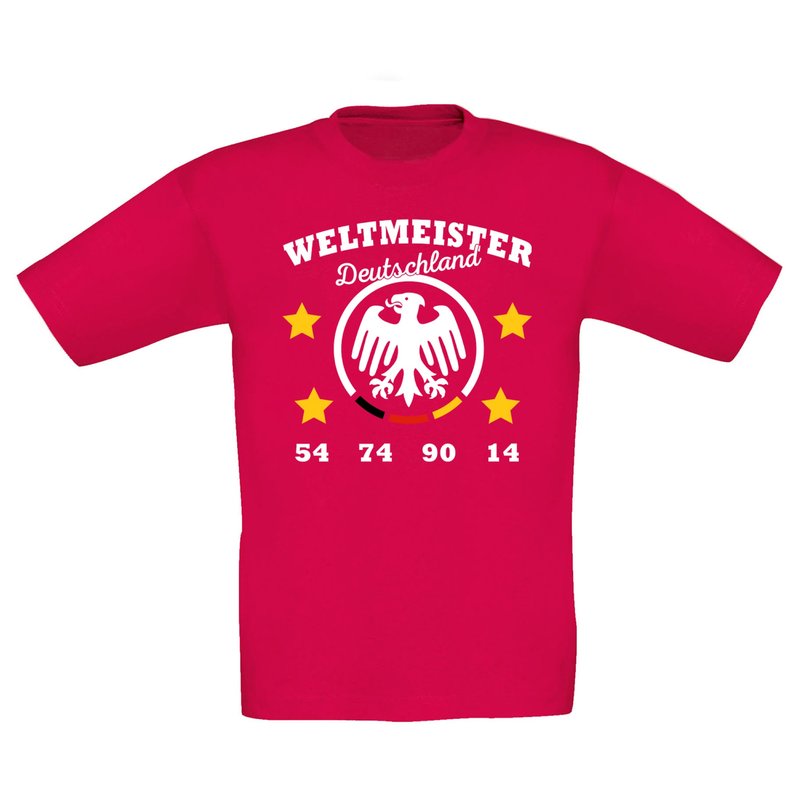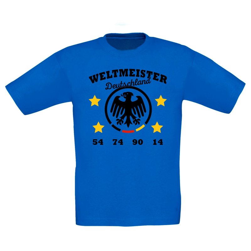 Motiv: Auf diesem T-Shirt ist der deutsche Bundesadler, mit den dazugehörigen WM-Titel-Sternen abgebildet. Wähle aus den verschiedenen Farbkombinationen und den Größen unserer Kinder T-Shirts deinen Favoriten und fiebert bei den kommenden Spielen mit!