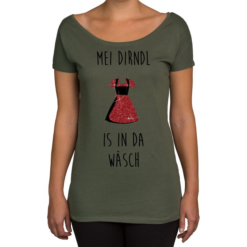 Oktoberfest Damen Shirts - U-Boot Ausschnitt und Tank Top - Mei Dirndl is in da Wäsch - Glitzer U-Boot oliv-goldglitzer XS